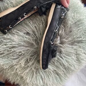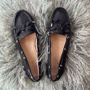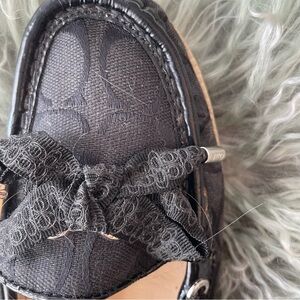 Chic black loafers with lace bow accents. Stylish and versatile.