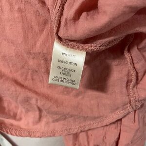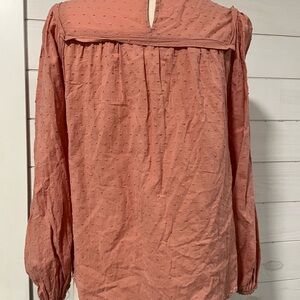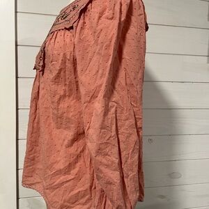 Elegant coral blouse with floral embroidery. Long sleeves and textured fabric. Ideal for casual or dressy wear.
