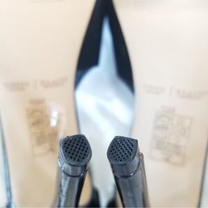 Special Features: beautiful peep toe with ankle strap, 4 inch stiletto heel, black suede and gold colored zippered heel.