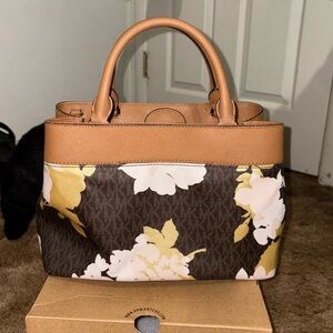 Stylish Michael Kors satchel with floral pattern. Features tan and yellow accents. Perfect for any occasion.