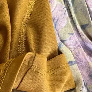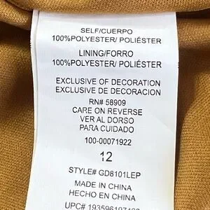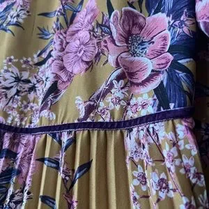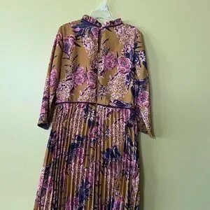 Elegant dress with long sleeves. Features pink and purple floral design on a tan background. Perfect for any occasion.