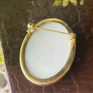 Elegant oval brooch featuring a scenic design with a gold trim. Perfect for adding a touch of sophistication to any outfit.
