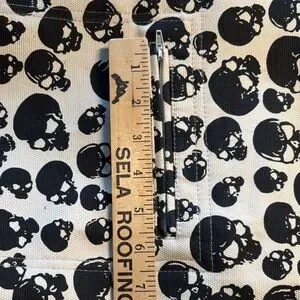 Skull pattern. Zip pocket. Adjustable strap.
