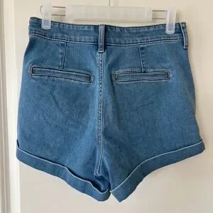 These Express jean shorts in a classic blue hue offer a high-waisted design with a relaxed fit and rolled hems, perfect for a casual, everyday look.