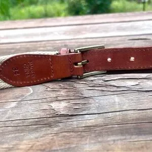Stylish Guy Harvey belt. Features brown leather and tan fabric. Perfect for casual wear. The belt itself measures 40 inches in length, not including the buckle.