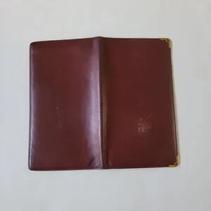 Cartier Paris Elegant burgundy leather long bifold wallet featuring gold corner accents. Perfect for a sophisticated look. See photos for wear, but still in very good condition.