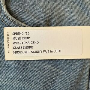 New with Sample Tag - Hudson Muse Crop Skinny with 5 inch Cuff in Size 25. These are sample stock so there is no material tags, but they are a thinner material. *Stock pictures to show what it looks like when you cuff the bottom hem.