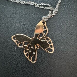 Charming butterfly pendant in gold. Suspended on a sleek silver chain. Ideal for any occasion.