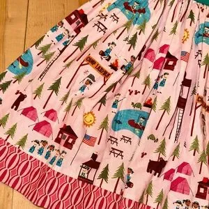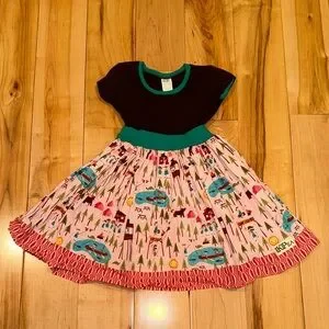 Fun dress with a black top and a colorful graphic skirt. Ideal for casual outings. EUC