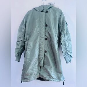 Sleek sage jacket with a stylish fur trim. Ideal for a modern look.