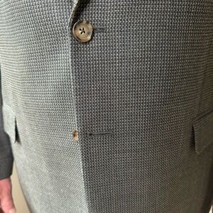 Size 44R. Joseph Abboud Collection for Nordstrom. Great condition - one small thread pull on sleeve - see last 2 photos. 52% Silk, 48% Wool. Textured grey/tan pattern. 2 button front. 4 buttons on sleeves. 2 front pockets, 1 breast pocket, 3 inside pockets. Double vent on back. Model in photo is 5’11”, wears 42R, waist 34. So fit may differ. Approximate measurements (taken when laying flat- cannot guarantee fit):