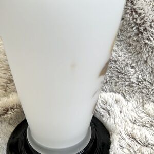 Frosted white satin glass vase with brown, orange and yellow flowers.