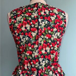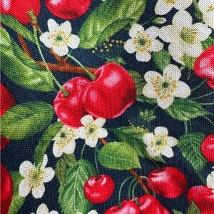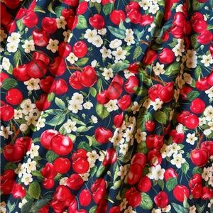 Navy dress with a print of red cherries and white cherry blossoms. Made of 100% cotton and a great layering piece! The back waist is elastic for added comfort. Pockets on the side and zips up the back! Unlined.