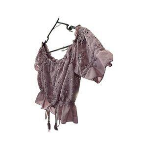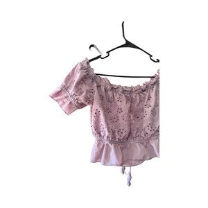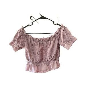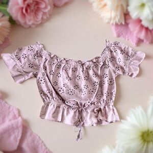 Embrace elegance with this pink eyelet off-shoulder top. Perfect for a chic, feminine look. Step into an enchanting realm with this whimsical Charlotte Rose top, woven from the dreams of fairytales. Drenched in a delicate shade of lavender, this 100% cotton, size small, off-the-shoulder peasant-style crop top whispers of woodland glades and twilight dances.