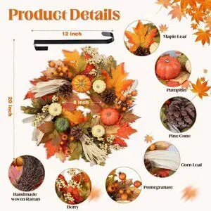Fall Wreaths for Front Door, 20inchs Autumn Wreath with Hangers Pumpkin Maple Au