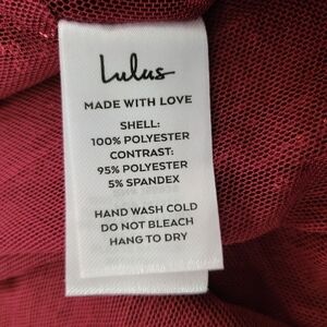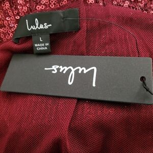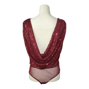 new with tag. dark red all over sequence bodysuit by lulus. the front is cross over with low cut design and back is a low dipping cowl back design. thong style with snaps for easy on and off. this would be stunning with a pair of wide leg black slacks or long flowy maxi skirt. so pretty and sexy at the same time