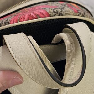 Elegant Gucci backpack with vibrant floral design. Beige base with gold accents. Small discoloration on small front pocket. No dust bag or box. Offers welcome.