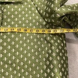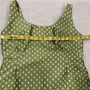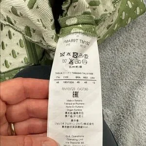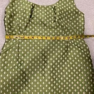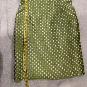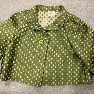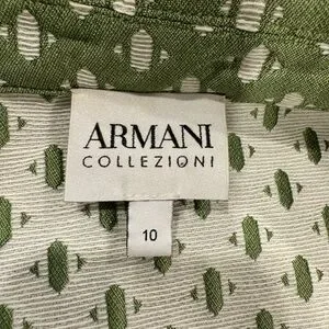 Gorgeous green Armani Collezioni sheath dress and matching one button jacket/coat. Authenticated through Authentic Detective. Beautiful green jacquard fabric with white diamond pattern woven in. The dress is a size 12 and has a hidden zip in the back and snap bands underneath the straps to secure under garments. The jacket is a size 10 and has a one button closure. It can be worn with the dress or would also be lovely with a pair of trousers or skirt. I see no flaws or stains except for a tiny imperfection in the thread on the inside of the jacket- NOT visible from the outside. See last pic.