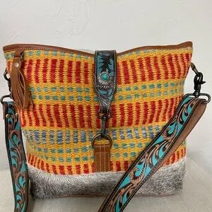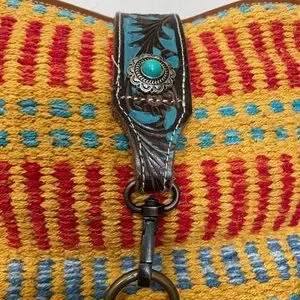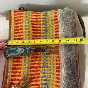 Vibrant and stylish, this women's bag features a colorful pattern with a unique design. Perfect for adding a pop of color to any outfit. See pictures for marks on straps.
