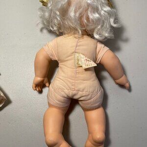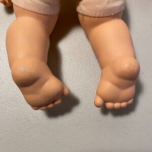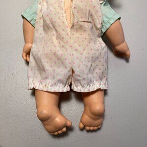 Please read re: condition: this doll comes with her hat and outfit; she is missing her booties and has a few scuffs on her heels. There is a stain on the left leg of her outfit and several small stains on her hat.