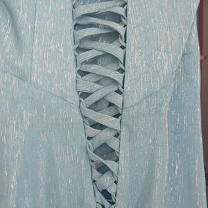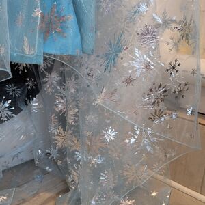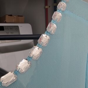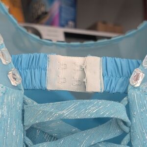Live out your Frozen fantasies in this gorgeous handmade Elsa dress. It features a hand-sewn rhinestone and heart-shaped bodice that has supportive cups and boning. The back is corset style so it can be custom tied to your body shape. Sheer aquamarine sleeves and neckline are also trimmed with rhinestones for extra sparkle. It is a stretchy netted material so it can fit many sizes.