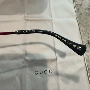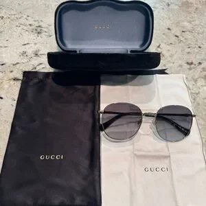 Elegant Gucci sunglasses arm with gold branding. Sleek black finish. Gucci GG1142S Gold and Black Round Sunglasses women. Everything in the picture is included. The glasses, case, cloth and pouch to store the case in. 100% authentic I can provide additional images upon request if needed. I bought these at my optometrist with no prescription on them. The temples were adjusted to fit on my ears as they kept sliding down. I’m sure you can adjust them to your ears at any optometrist if needed! :) Great condition! Offers Welcome! :) 🤗 minimal signs of wear as pictured.