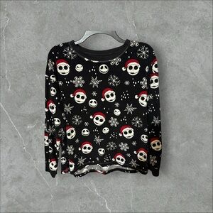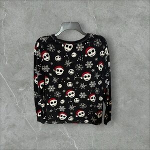 The black shirt is adorned with a pattern of Jack Skellington's head wearing a Santa hat, along with white snowflakes and other skull-like faces. Size M (8-10). PP 22. L 23