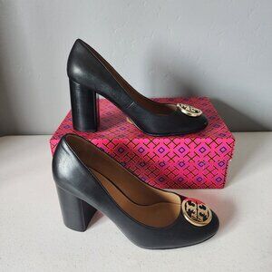 "NEW" Gorgeous Smooth Black Leather Benton Pumps By Tory Burch. Slip on Style, Rounded Toe with Gold Tone Logo Medallion Accent, Stacked 3.5" Block Style Heel & Rubber Soles, Leather Upper, Lining & Cushioned Foot Bed, New, Never Worn, Only Tried On, Box Included:) Rt.304.00 approx. Size 8.5, Foot Bed Measures 10" for Reference. * Perfect Event, Business, Church Heels.