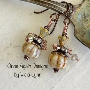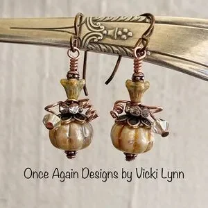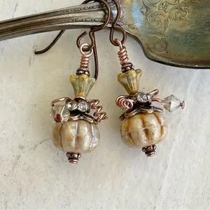 accessory, artisan, artistic, artsy, boho, bohemian, Czech glass, dangle, drop, earthy, fairy core, Fall, festive, fun, event, gift, glass, hand crafted, hand created, handmade, hippie, jewelry, limited edition, pumpkin, woodland, unique; onceagaindesignsbyvickilynn