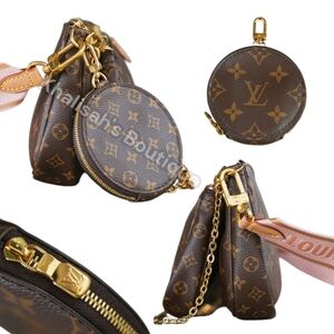 The Multi Pochette Accessoires is a hybrid cross-body bag with multiple pockets and compartments that brings together a Pochette Accessoires, a Mini Pochette Accessoires and a Round Coin Purse. Fashioned from Monogram canvas with a mini Monogram pattern on the sides of the two pochettes, it has both a removable gold-tone chain and an adjustable Louis Vuitton inscribed Jacquard strap for multiple carrying options.