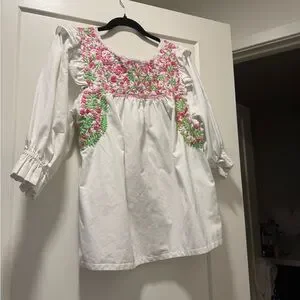 Elegant blouse with intricate pink and green floral embroidery. Soft white fabric. Perfect for any occasion.