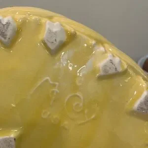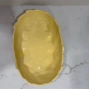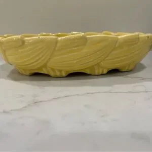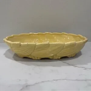 Brighten your collection with this cheerful vintage McCoy pottery bowl in a glossy butter yellow glaze. Featuring a scalloped rim and raised leaf/swirl pattern, this piece brings classic mid-century modern (MCM) charm to any space. Perfect as a centerpiece, fruit bowl, planter, or simply as a display piece.