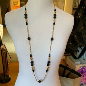 Premier designs long necklace with faceted black crystals, gold & black beads on a textured gold tone chain.
