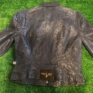 Stylish leather jacket with python print. Features a sleek design. Perfect for any occasion.