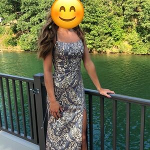Step into elegance with this stunning purple paisley iridescent evening gown. Perfect for special occasions, this dress features a flowing silhouette and intricate design. Make a statement with its rich colors and sophisticated style.