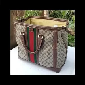 Elegant Gucci duffel bag with signature red and green stripe. Beige and brown tones. Ideal for travel or daily use.