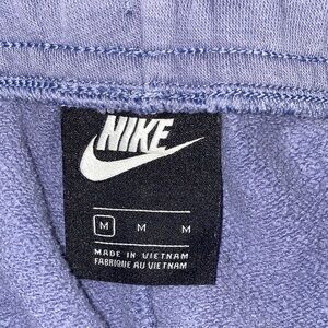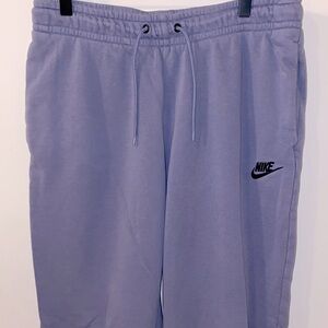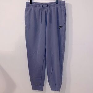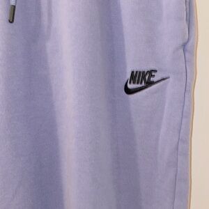 Stylish Nike joggers in a soft lavender shade. Features an adjustable drawstring waist. Black logo detail on the side.