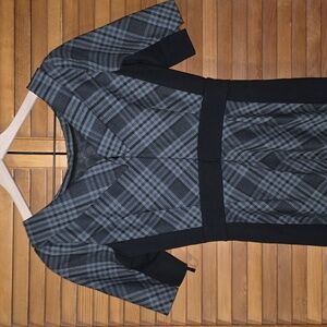 style: bias plaid, sheath, silky lining, midi length, longer short sleeves, slightly off the shoulder