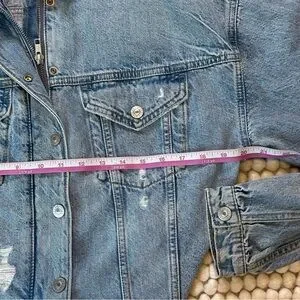 ๐ AMERICAN EAGLE Cropped Raw Hem Hooded Distressed Denim Jean Jacket Size Medium