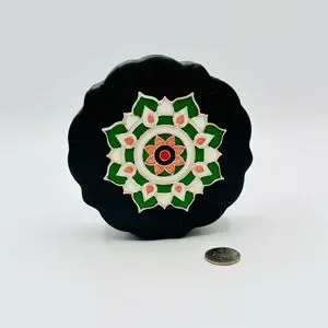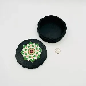 Elegant black decorative box featuring a vibrant green and pink mandala design. Perfect for adding a touch of style to any room.