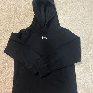 Gently used but very good condition black Under Armour hoodie, size youth small. Features Under Armour logo on chest and kangaroo pocket on front.