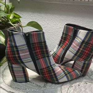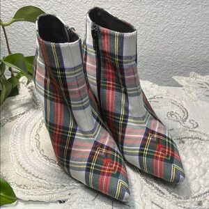 Step out in style with these chic plaid ankle boots. Perfect for adding a pop of color to any outfit. There is a bit of a bubble beneath the cloth on right shoe at about the ankle.