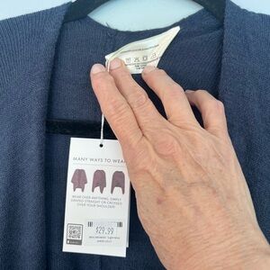 Stylish navy blue shawl with a flowing design. Perfect for layering. New with tags.