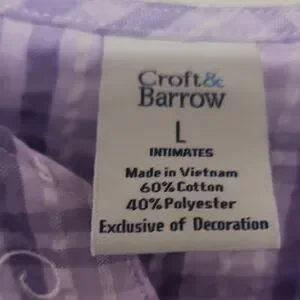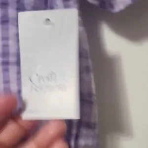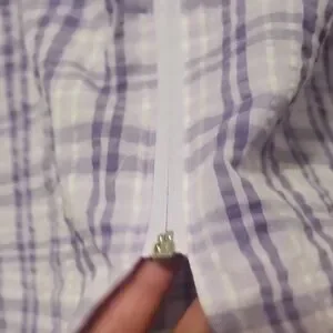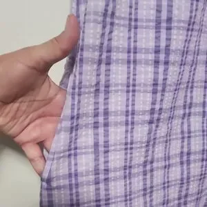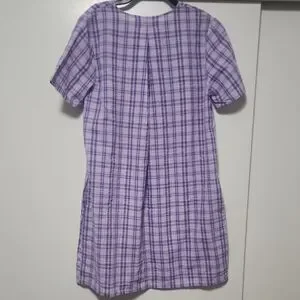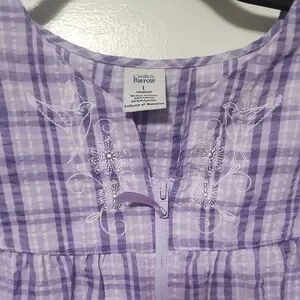 Charming lavender plaid blouse with delicate embroidery. Features a front zipper for easy wear.