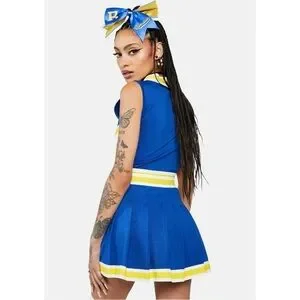 Brand New Never Been Worn Tags Still Attached Sold Out Blue, Yellow & White Dolls Kill x Archie Comics School Pride Riverdale High School Bulldogs Cheerleader Cheerleading Cheer Veronica Betty Cosplay Halloween Costume Uniform Set With Crop Top, Pleated Skirt & Bow In A Womens Size XSmall XS๐๐ฃ๐
