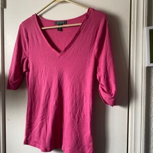 Lauren Ralph Lauren Pink V-Neck Top 1/2 Sleeve Knit Shirt Womens tee prep preppy