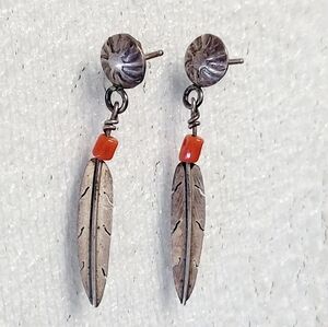 These sterling silver feather dangle post earrings with orange bead (I believe it's coral, but not 100% sure) are a beautiful representation of Native American jewelry. 1 1/2" long.