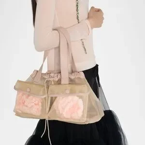 Chic tote with delicate floral accents. Beige body with blush details. Perfect for stylish occasions.
