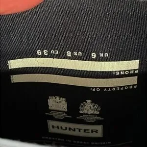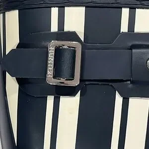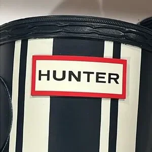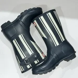 Stay stylish on rainy days with these authentic Hunter rain boots featuring a chic navy base with bold vertical white stripes. Designed with the classic Hunter durability and comfort, these boots are perfect for keeping your feet dry while making a fashion statement. Complete with the iconic red and white rubberised Hunter logo appliquéd to the front. Size 8.