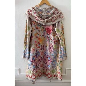 Shyli Biya Duster Johnny Was Sm NWT, beautiful embroidered rare pattern. Like cream background, colorful mix floral pattern. hood pockets.
